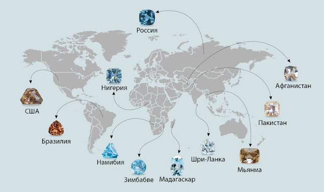 Крупнейшие месторождения топазов находятся в Бразилии, в штате Минас-Жерайс. Здесь добывают бесцветные, светло-голубые, жёлтые, оранжево-жёлтые топазы. Помимо Бразилии, топаз добывают также в России (Уральский регион), Украине, Бирме, Пакистане и на Шри-Ланке (Цейлон). В природе встречаются кристаллы топаза до 200 килограммов.