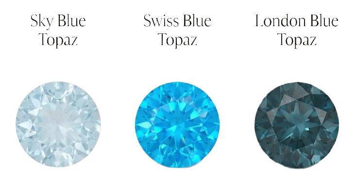 В настоящие время на рынке преобладают облученные голубые топазы, которые делятся по насыщенности окраски на: «Sky-blue topaz», «Swiss-topaz», «London-blue topaz».