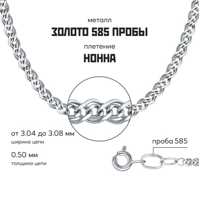 Московский Цепевязальный Завод - современный взгляд на вековое наследие цепевязания: неизменно высокое качество, технологичность и надежное российское производство. Плетение "Нонна" прочное и оригинальное. Его секрет состоит в том, что в больших звеньях расположены маленькие элементы. Они скрепляются между собой крест на крест и выглядят объемно и стильно. Бренд изделия может отличаться от заявленного в описании. В этом случае украшение под другим брендом по своим качественным и потребительским характеристикам ничем не уступает указанному в описании. Фактический завод-производитель указан на бирке каждого изделия.