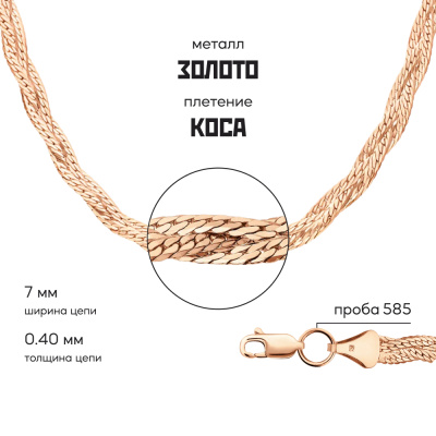 Московский Цепевязальный Завод - современный взгляд на вековое наследие цепевязания: неизменно высокое качество, технологичность и надежное российское производство. Плетение "Косичка" состоит из плоских, переплетающихся цепей. Такое украшение самодостаточно и не нуждается в дополнительных аксессуарах. Отлично держит форму, но требует аккуратного обращения. Бренд изделия может отличаться от заявленного в описании. В этом случае украшение под другим брендом по своим качественным и потребительским характеристикам ничем не уступает указанному в описании. Фактический завод-производитель указан на бирке каждого изделия.