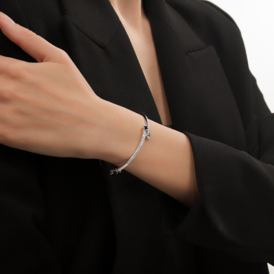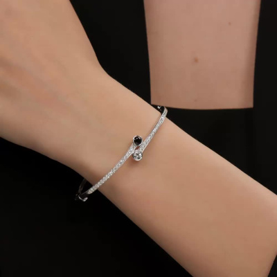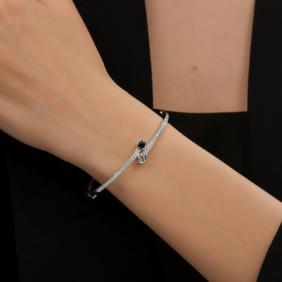 Браслет с 34 бриллиантами природными, 0.68 карат, огранка круг 57 граней, цвет 3, чистота 6, тип огранки А; 1 сапфиром бесцветным природным, 0.35 карат; 1 сапфиром природным, 0.26 карат, цвет 2, чистота 2, тип огранки В; Белое золото 585 пробы.
