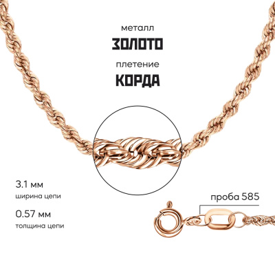 Московский Цепевязальный Завод - современный взгляд на вековое наследие цепевязания: неизменно высокое качество, технологичность и надежное российское производство. Цепи плетения «Корда» имеют особенный, сложный рисунок. Кольца цепочки, переплетаясь между собой, образуют красивую волну и напоминают канат. На солнце украшение приобретает неповторимый благородный блеск. Цепи, сплетенные по технологии «Корда», – это универсальные украшения. Их можно носить как отдельно, так и в сочетании с крестами или подвесками. Бренд изделия может отличаться от заявленного в описании. В этом случае украшение под другим брендом по своим качественным и потребительским характеристикам ничем не уступает указанному в описании. Фактический завод-производитель указан на бирке каждого изделия.