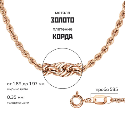 Московский Цепевязальный Завод - современный взгляд на вековое наследие цепевязания: неизменно высокое качество, технологичность и надежное российское производство. Цепи плетения «Корда» имеют особенный, сложный рисунок. Кольца цепочки, переплетаясь между собой, образуют красивую волну и напоминают канат. На солнце украшение приобретает неповторимый благородный блеск. Цепи, сплетенные по технологии «Корда», – это универсальные украшения. Их можно носить как отдельно, так и в сочетании с крестами или подвесками. Бренд изделия может отличаться от заявленного в описании. В этом случае украшение под другим брендом по своим качественным и потребительским характеристикам ничем не уступает указанному в описании. Фактический завод-производитель указан на бирке каждого изделия.
