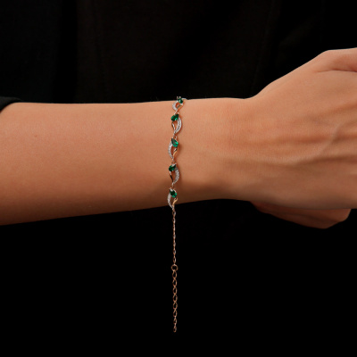 Браслет с 40 бриллиантами природными, 0.17 карат, огранка круг 17 граней, цвет 2, чистота 2; 8 гидротермальными изумрудами, 1.44 карат; Розовое золото 585 пробы.