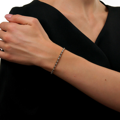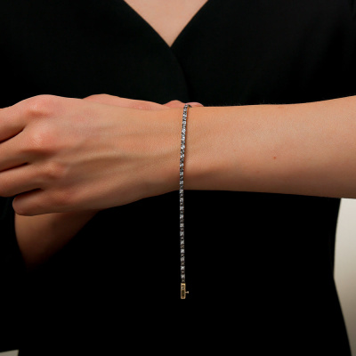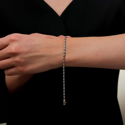 Браслет с 29 бриллиантами природными, 0.205 карат, огранка круг 17 граней, цвет 2, чистота 2, тип огранки А; 30 бриллиантами коньячными природными, 0.198 карат, огранка круг 57 граней, цвет 7, чистота 6, тип огранки А; Желтое и белое золото 585 пробы.
