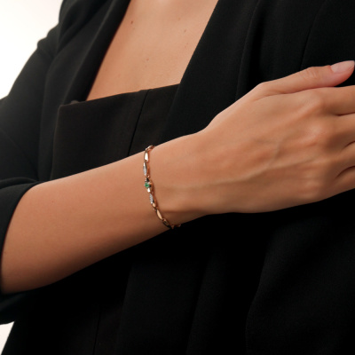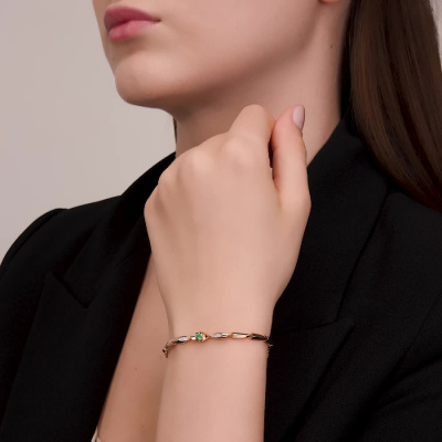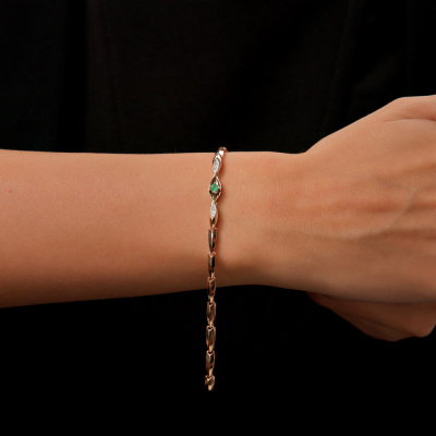 Браслет с 12 бриллиантами природными, 0.03 карат, огранка круг 17 граней, цвет 2, чистота 2, тип огранки А; 1 изумрудом природным, 0.08 карат, цвет 3, чистота 3, тип огранки В; Розовое и белое золото 585 пробы.