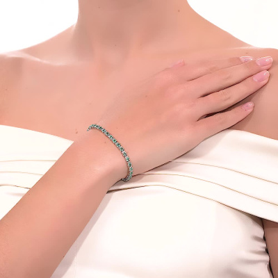Браслет с 74 бриллиантами природными, 0.88 карат, огранка круг 17 граней, цвет 2, чистота 3, тип огранки Б; 37 изумрудами природными, 3.66 карат, цвет 3, чистота 3, тип огранки В; Белое золото 585 пробы.