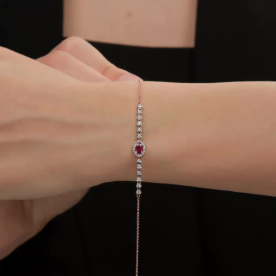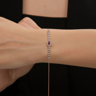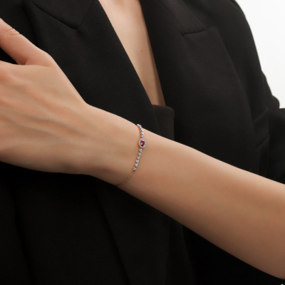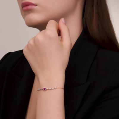 Браслет с 12 бриллиантами природными, 0.17 карат, огранка круг 57 граней, цвет 3, чистота 6, тип огранки А; 16 бриллиантами природными, 0.06 карат, огранка круг 17 граней, цвет 2, чистота 2, тип огранки Б; 1 рубином природным, 0.27 карат, цвет 2, чистота 2, тип огранки Б; Розовое золото 585 пробы.