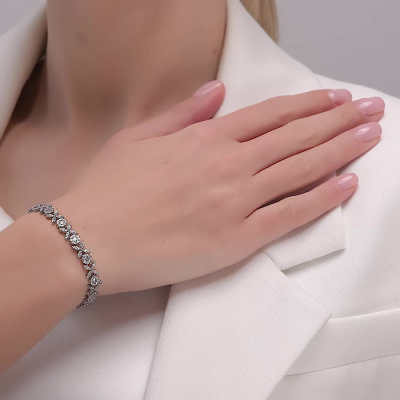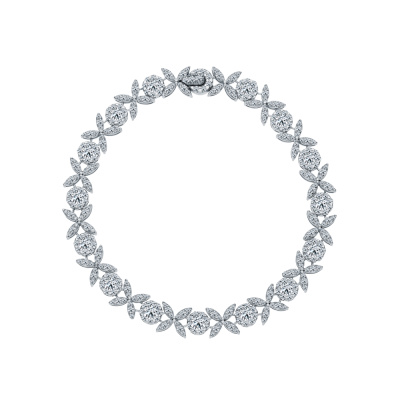 Браслет с 15 бриллиантами природными, 1.15 карат, огранка круг 57 граней, цвет 3, чистота 6, тип огранки А; 193 бриллиантами природными, 2.16 карат, огранка круг 57 граней, цвет 3, чистота 6, тип огранки А; 128 бриллиантами природными, 0.4 карат, огранка круг 57 граней, цвет 3, чистота 6, тип огранки А; Белое золото 585 пробы.