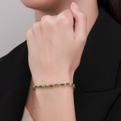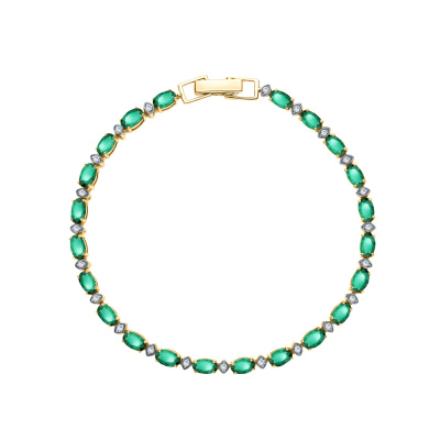 Браслет с 21 бриллиантом природным, 0.18 карат, огранка круг 17 граней, цвет 2, чистота 2, тип огранки А; 21 изумрудом природным, 4.49 карат, цвет 3, чистота 3, тип огранки Б; Желтое золото 585 пробы.