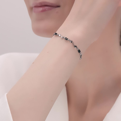 Браслет с 12 бриллиантами природными, 0.36 карат, огранка круг 57 граней, цвет 3, чистота 6, тип огранки А; 6 сапфирами природными, 1.78 карат, цвет 3, чистота 3, тип огранки Б; Белое золото 585 пробы.