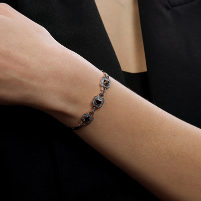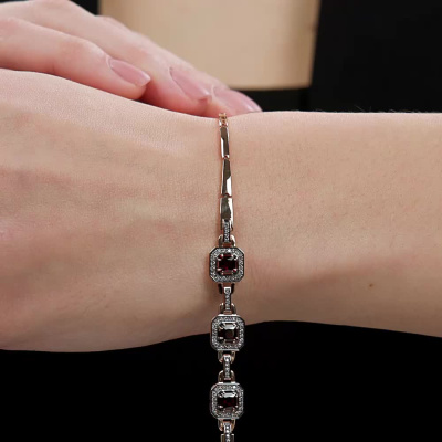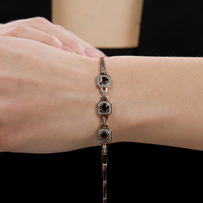 Браслет с 3 гранатами природными, 1.38 карат; 60 бриллиантами коньячными природными, 0.24 карат, огранка круг 57 граней, цвет 7, чистота 5, тип огранки А; 16 бриллиантами коньячными природными, 0.04 карат, огранка круг 57 граней, цвет 7, чистота 5, тип огранки А; Розовое золото 585 пробы.