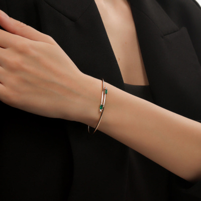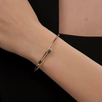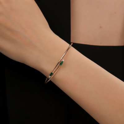 Браслет с 2 бриллиантами природными, 0.05 карат, огранка круг 57 граней, цвет 4, чистота 5, тип огранки А; 2 гидротермальными изумрудами, 0.33 карат; Розовое золото 585 пробы.