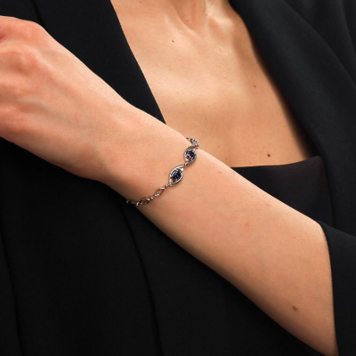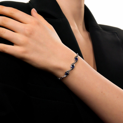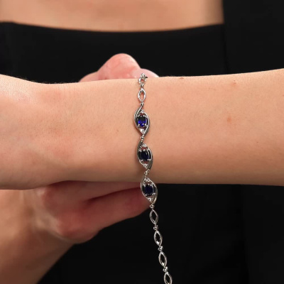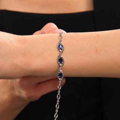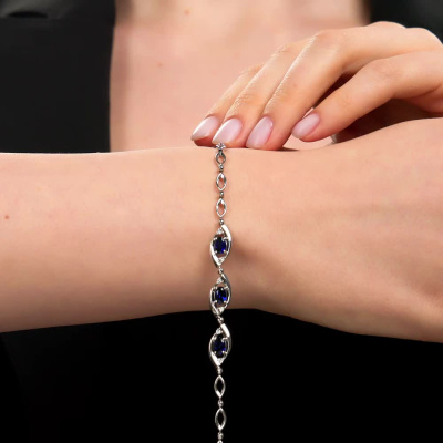 Браслет с 6 бриллиантами природными, 0.08 карат, огранка круг 57 граней, цвет 4, чистота 5, тип огранки А; 3 сапфирами синтетическими, 1.61 карат; Белое золото 585 пробы.