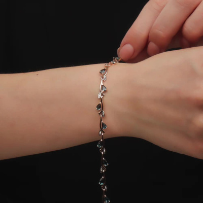 Браслет с 11 бриллиантами природными, 0.04 карат, огранка круг 17 граней, цвет 2, чистота 2, тип огранки А; 11 топазами лондон природными, 2.68 карат; Розовое золото 375 пробы.