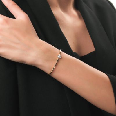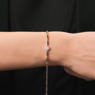 Браслет с 1 бриллиантом природным, 0.03 карат, огранка круг 57 граней, цвет 3, чистота 6, тип огранки А; 6 бриллиантами природными, 0.04 карат, огранка круг 57 граней, цвет 3, чистота 6, тип огранки А; 19 бриллиантами природными, 0.04 карат, огранка круг 17 граней, цвет 2, чистота 3, тип огранки А; Желтое золото 585 пробы.
