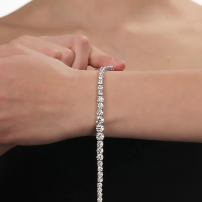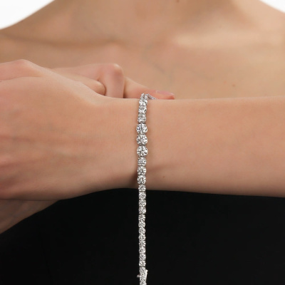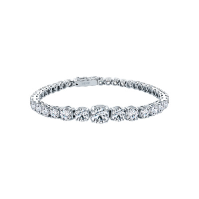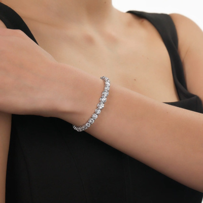 Браслет с 1 бриллиантом выращенным, 1.65 карат, огранка круг 57 граней, цвет 4, чистота 5, тип огранки А; 4 бриллиантами выращенными, 3.34 карат, огранка круг 57 граней, цвет 4, чистота 5, тип огранки А; 6 бриллиантами выращенными, 3.03 карат, огранка круг 57 граней, цвет 4, чистота 5, тип огранки А; 6 бриллиантами выращенными, 1.48 карат, огранка круг 57 граней, цвет 3, чистота 5, тип огранки А; 20 бриллиантами выращенными, 4.3 карат, огранка круг 57 граней, цвет 3, чистота 5, тип огранки А; Белое золото 585 пробы.