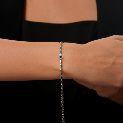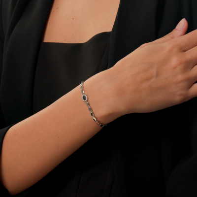 Браслет с 14 бриллиантами природными, 0.05 карат, огранка круг 17 граней, цвет 2, чистота 3, тип огранки А; 1 сапфиром природным, 0.28 карат, цвет 2, чистота 2, тип огранки Б; Белое золото 585 пробы.