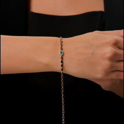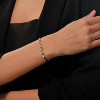 Браслет с 14 бриллиантами природными, 0.05 карат, огранка круг 17 граней, цвет 2, чистота 3, тип огранки А; 1 изумрудом природным, 0.19 карат, цвет 3, чистота 3, тип огранки Б; Розовое золото 585 пробы.
