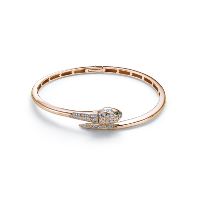Браслет с 15 бриллиантами природными, 0.11 карат, огранка круг 57 граней, цвет 3, чистота 6, тип огранки А; 67 бриллиантами природными, 0.24 карат, огранка круг 17 граней, цвет 2, чистота 3, тип огранки А; 2 изумрудами природными, 0.01 карат, цвет 3, чистота 3, тип огранки Б; Розовое золото 585 пробы.