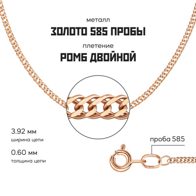 Московский Цепевязальный Завод - современный взгляд на вековое наследие цепевязания: неизменно высокое качество, технологичность и надежное российское производство. Цепочки с ромбом в основе плетения очень популярны и пользуются спросом. В этом случае каждое из звеньев представляет собой одноимённую геометрическую фигуру. Одинаковые противоположные углы или квадраты вытянутой формы составляют прочную конструкцию и красивое украшение. Это одна из классических форм плетений, но у неё есть несколько разновидностей. Бренд изделия может отличаться от заявленного в описании. В этом случае украшение под другим брендом по своим качественным и потребительским характеристикам ничем не уступает указанному в описании. Фактический завод-производитель указан на бирке каждого изделия.