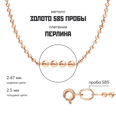 Московский Цепевязальный Завод - современный взгляд на вековое наследие цепевязания: неизменно высокое качество, технологичность и надежное российское производство. Цепочка с плетением "Перлина" - украшение подчеркивающее вашу женственность. «Pearl» с английского – «жемчужина». Отсюда и название плетения – "Перлина". Цепочка состоит из особых звеньев – шариков (круглых, продолговатых) расположенных на золотой проволоке. Цепочка "Перлина" может быть как самодостаточным украшением, так и носиться с подвесками и кулонами.
