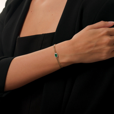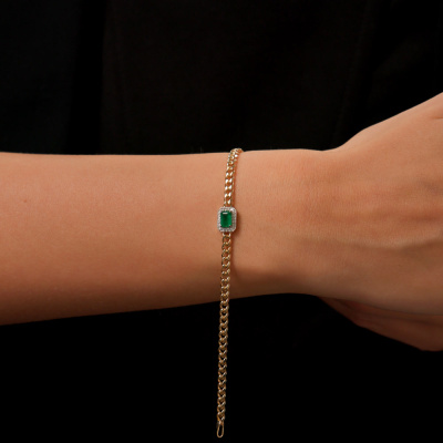 Браслет с 20 бриллиантами природными, 0.08 карат, огранка круг 17 граней, цвет 2, чистота 2, тип огранки А; 1 изумрудом природным, 0.49 карат, цвет 3, чистота 3, тип огранки Б; Желтое золото 585 пробы.