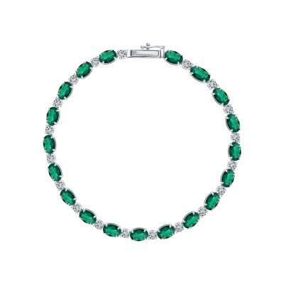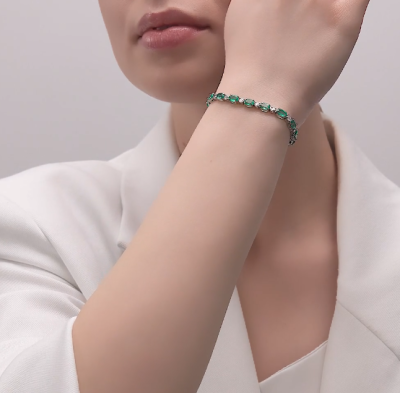Браслет с 19 бриллиантами природными, 1.61 карат, огранка круг 57 граней, цвет 3, чистота 6, тип огранки А; 19 изумрудами природными, 6.73 карат, цвет 3, чистота 3, тип огранки Б; Белое золото 585 пробы.