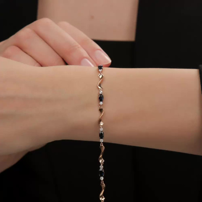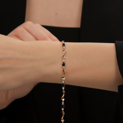 Браслет с 12 бриллиантами природными, 0.35 карат, огранка круг 57 граней, цвет 3, чистота 6, тип огранки А; 6 сапфирами природными, 1.75 карат, цвет 2, чистота 2, тип огранки Б; Розовое золото 585 пробы.
