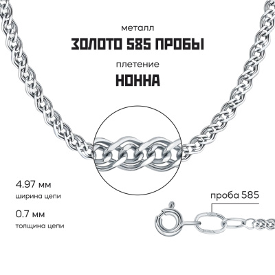 Московский Цепевязальный Завод - современный взгляд на вековое наследие цепевязания: неизменно высокое качество, технологичность и надежное российское производство. Плетение "Нонна" прочное и оригинальное. Его секрет состоит в том, что в больших звеньях расположены маленькие элементы. Они скрепляются между собой крест на крест и выглядят объемно и стильно. Бренд изделия может отличаться от заявленного в описании. В этом случае украшение под другим брендом по своим качественным и потребительским характеристикам ничем не уступает указанному в описании. Фактический завод-производитель указан на бирке каждого изделия.
