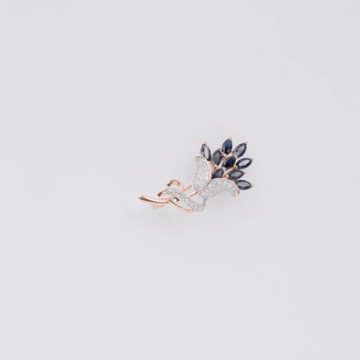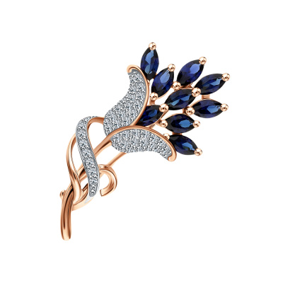 Брошь с 44 бриллиантами природными, 0.23 карат, огранка круг 17 граней, цвет 2, чистота 2, тип огранки Б; 9 сапфирами синтетическими, 1.42 карат; Розовое золото 585 пробы.