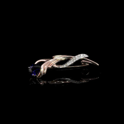 Брошь с 5 бриллиантами природными, 0.02 карат, огранка круг 17 граней, цвет 2, чистота 2; 4 бриллиантами природными, 0.01 карат, огранка круг 17 граней, цвет 2, чистота 2; 1 сапфиром синтетическим, 0.83 карат; Розовое золото 585 пробы.