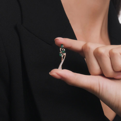 Брошь с 7 бриллиантами природными, 0.02 карат, огранка круг 17 граней, цвет 2, чистота 2; 5 бриллиантами природными, 0.01 карат, огранка круг 17 граней, цвет 2, чистота 2; 3 гидротермальными изумрудами, 0.66 карат; Розовое золото 585 пробы.