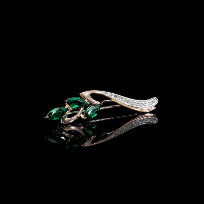 Золотая брошь с бриллиантами природными и изумрудами выращенными