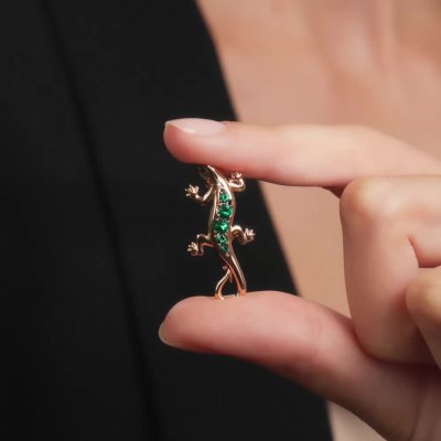 Брошь с 2 гидротермальными изумрудами, 0.19 карат; 2 гидротермальными изумрудами, 0.08 карат; 1 гидротермальным изумрудом, 0.02 карат; 2 бриллиантами черными природными облагороженными, 0.01 карат, огранка круг 57 граней, цвет 7, чистота 6, тип огранки А; Розовое золото 585 пробы.