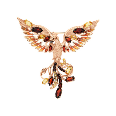 Золотая брошь с эмалью, цитринами природными и гранатами природными