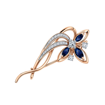 Брошь с 7 бриллиантами природными, 0.02 карат, огранка круг 17 граней, цвет 2, чистота 2, тип огранки А; 11 бриллиантами природными, 0.01 карат, огранка круг 17 граней, цвет 2, чистота 2, тип огранки А; 1 сапфиром природным, 0.16 карат, цвет 2, чистота 2, тип огранки Б; 2 сапфирами природными, 0.22 карат, цвет 2, чистота 2, тип огранки Б; 1 топазом бесцветным природным, 0.07 карат; 2 топазами бесцветными природными, 0.07 карат; Розовое золото 585 пробы.