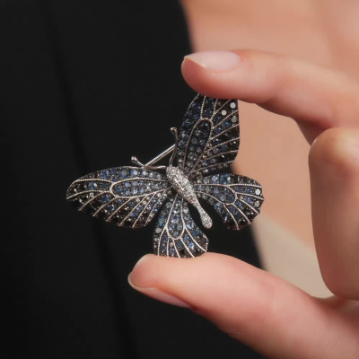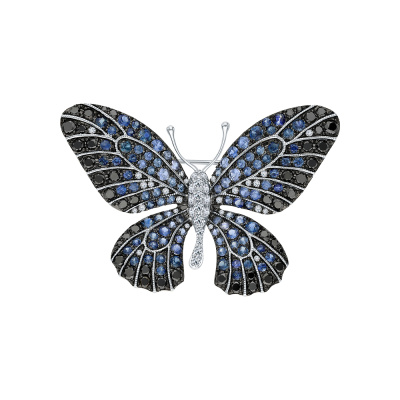 Брошь с 4 бриллиантами природными, 0.07 карат, огранка круг 57 граней, цвет 4, чистота 6; 11 бриллиантами природными, 0.17 карат, огранка круг 57 граней, цвет 4, чистота 6; 13 бриллиантами природными, 0.06 карат, огранка круг 57 граней, цвет 4, чистота 6; 12 бриллиантами природными, 0.03 карат, огранка круг 57 граней, цвет 4, чистота 6; 2 бриллиантами черными природными облагороженными, 0.13 карат, огранка круг 57 граней, цвет 7, чистота 6; 6 бриллиантами черными природными облагороженными, 0.27 карат, огранка круг 57 граней, цвет 7, чистота 6; 16 бриллиантами черными природными облагороженными, 0.61 карат, огранка круг 57 граней, цвет 7, чистота 6; 10 бриллиантами черными природными облагороженными, 0.28 карат, огранка круг 57 граней, цвет 7, чистота 6; 100 сапфирами природными, 2.6 карат, цвет 3, чистота 4; 8 бриллиантами черными природными облагороженными, 0.14 карат, огранка круг 57 граней, цвет 7, чистота 6; 4 бриллиантами черными природными облагороженными, 0.02 карат,