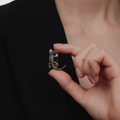 Золотая брошь с бриллиантами чёрными природными и изумрудами природными