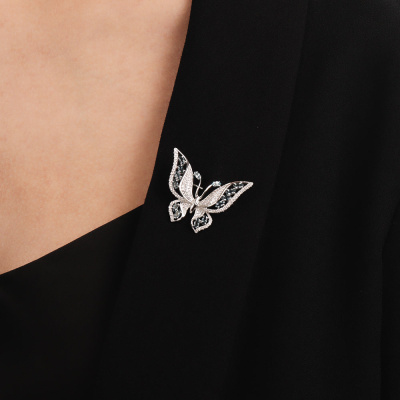 Брошь с 120 бриллиантами природными, 0.48 карат, огранка круг 17 граней, цвет 2, чистота 2, тип огранки А; 12 топазами лондон природными, 1.27 карат; 2 топазами свисс природными, 0.16 карат; Белое золото 585 пробы.