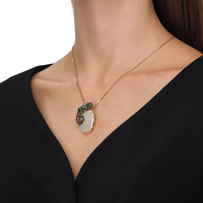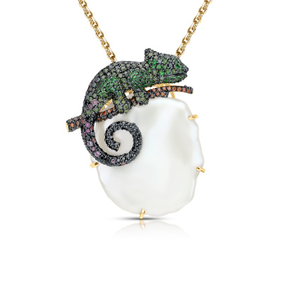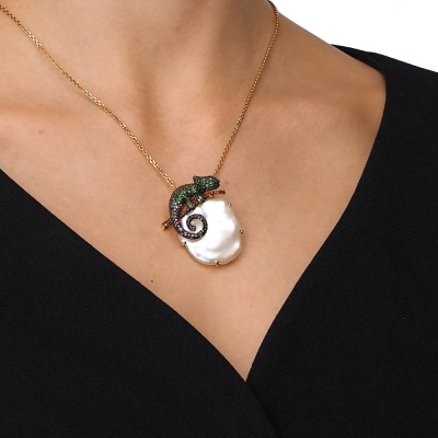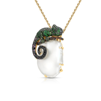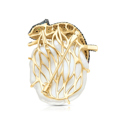 Брошь с 1 жемчуом барочным культивированным белым, 24.67 карат, тип огранки А; 3 бриллиантами фиолетовыми облагороженными, 0.04 карат, огранка круг 57 граней, цвет 5, чистота 5, тип огранки А; 8 гранатами зелеными природными, 0.09 карат, тип огранки А; 27 бриллиантами зелеными природными облагороженными, 0.23 карат, огранка круг 57 граней, цвет 5, чистота 5, тип огранки А; 21 бриллиантом черным природным облагороженным, 0.18 карат, огранка круг 57 граней, цвет 7, чистота 6, тип огранки А; 10 аметистами природными, 0.07 карат, тип огранки А; 62 гранатами зелеными природными, 0.44 карат, тип огранки А; 10 бриллиантами синими природными облагороженными, 0.06 карат, огранка круг 57 граней, цвет 5, чистота 6, тип огранки А; 39 бриллиантами синими природными облагороженными, 0.24 карат, огранка круг 57 граней, цвет 5, чистота 6, тип огранки А; 53 бриллиантами зелеными природными облагороженными, 0.29 карат, огранка круг 57 граней, цвет 5, чистота 5, тип огранки А; 6 бриллиантами фи