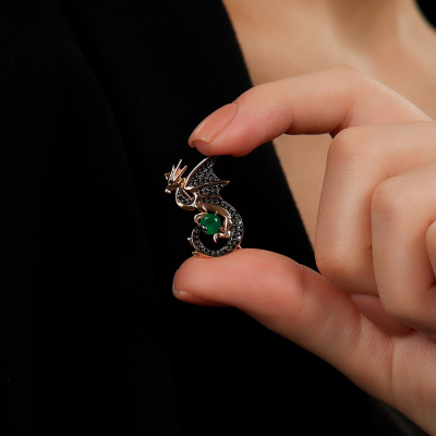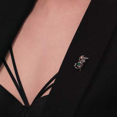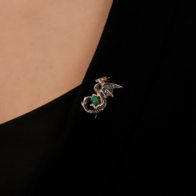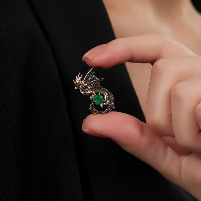 Брошь с 56 бриллиантами черными природными облагороженными, 0.25 карат, огранка круг 57 граней, цвет 7, чистота 6, тип огранки А; 1 агатом зеленым природным; Розовое золото 585 пробы.