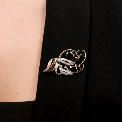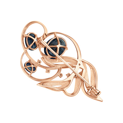 Брошь с 5 бриллиантами природными, 0.06 карат, огранка круг 57 граней, цвет 3, чистота 5, тип огранки А; 35 бриллиантами природными, 0.32 карат, огранка круг 57 граней, цвет 3, чистота 5, тип огранки А; 26 бриллиантами природными, 0.09 карат, огранка круг 57 граней, цвет 3, чистота 5, тип огранки А; 3 сапфирами природными, 6.43 карат, цвет 2, чистота 2, тип огранки Б; Розовое золото 585 пробы.