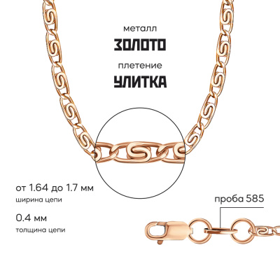 Московский Цепевязальный Завод - современный взгляд на вековое наследие цепевязания: неизменно высокое качество, технологичность и надежное российское производство. "Улитка" - плетение, звенья которого закручены в спираль и при соединении внешне напоминают улитку. Бренд изделия может отличаться от заявленного в описании. В этом случае украшение под другим брендом по своим качественным и потребительским характеристикам ничем не уступает указанному в описании. Фактический завод-производитель указан на бирке каждого изделия.