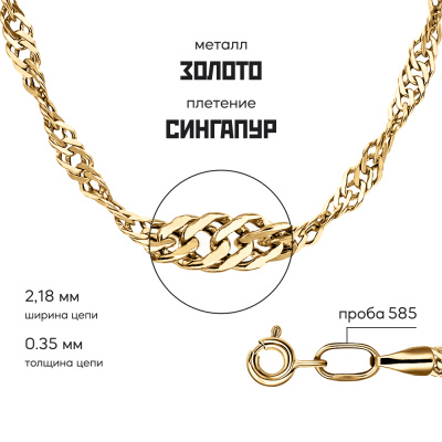 Московский Цепевязальный Завод - современный взгляд на вековое наследие цепевязания: неизменно высокое качество, технологичность и надежное российское производство. "Сингапур" – цепь создана на основе двойного панцирного плетения. Звенья соединены между собой таким образом, что цепь начинает красиво переливаться. Сложная спиралевидная структура обеспечивает блеск при вращении в лучах света. Плетение отличается утонченностью, нежностью и легкостью. Украшения превосходно дополнят и вечерний наряд, и повседневный образ. Бренд изделия может отличаться от заявленного в описании. В этом случае украшение под другим брендом по своим качественным и потребительским характеристикам ничем не уступает указанному в описании. Фактический завод-производитель указан на бирке каждого изделия.