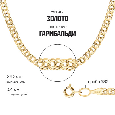 Московский Цепевязальный Завод - современный взгляд на вековое наследие цепевязания: неизменно высокое качество, технологичность и надежное российское производство. «Гарибальди» — объемное якорное плетение с парными круглыми звеньями, считается высокопрочным и одним из самых надежных. Плетение названо в честь супругов Гарибальди, героев освободительного движения Италии, которые всегда были вместе и разделяли взгляды друг друга. Бренд изделия может отличаться от заявленного в описании. В этом случае украшение под другим брендом по своим качественным и потребительским характеристикам ничем не уступает указанному в описании. Фактический завод-производитель указан на бирке каждого изделия.
