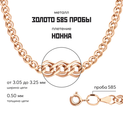 Московский Цепевязальный Завод - современный взгляд на вековое наследие цепевязания: неизменно высокое качество, технологичность и надежное российское производство. Плетение "Нонна" прочное и оригинальное. Его секрет состоит в том, что в больших звеньях расположены маленькие элементы. Они скрепляются между собой крест на крест и выглядят объемно и стильно. Бренд изделия может отличаться от заявленного в описании. В этом случае украшение под другим брендом по своим качественным и потребительским характеристикам ничем не уступает указанному в описании. Фактический завод-производитель указан на бирке каждого изделия.