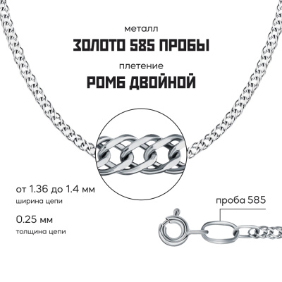 Московский Цепевязальный Завод - современный взгляд на вековое наследие цепевязания: неизменно высокое качество, технологичность и надежное российское производство. Цепочки с ромбом в основе плетения очень популярны и пользуются спросом. В этом случае каждое из звеньев представляет собой одноимённую геометрическую фигуру. Одинаковые противоположные углы или квадраты вытянутой формы составляют прочную конструкцию и красивое украшение. Это одна из классических форм плетений, но у неё есть несколько разновидностей. Бренд изделия может отличаться от заявленного в описании. В этом случае украшение под другим брендом по своим качественным и потребительским характеристикам ничем не уступает указанному в описании. Фактический завод-производитель указан на бирке каждого изделия.