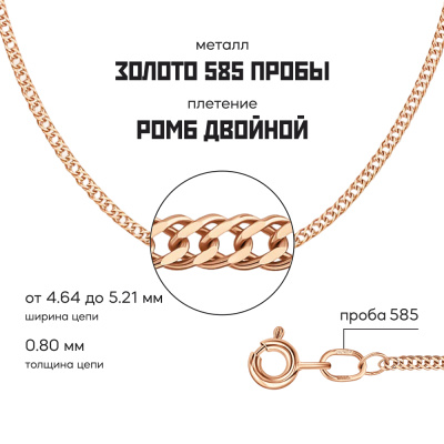 Московский Цепевязальный Завод - современный взгляд на вековое наследие цепевязания: неизменно высокое качество, технологичность и надежное российское производство. За счёт сложной геометрии плетение "Ромб" выглядит объемно и по-настоящему изысканно. Свет необычным образом отражается от звеньев. Цепочки с ромбом в основе плетения очень популярны и пользуются спросом. В этом случае каждое из звеньев представляет собой одноимённую геометрическую фигуру. Одинаковые противоположные углы или квадраты вытянутой формы составляют прочную конструкцию. Цепочка надолго сохраняет свой первоначальный праздничный блеск и красоту. Это одна из классических форм плетений, но у неё есть несколько разновидностей. Бренд изделия может отличаться от заявленного в описании. В этом случае украшение под другим брендом по своим качественным и потребительским характеристикам ничем не уступает указанному в описании. Фактический завод-производитель указан на бирке каждого изделия.