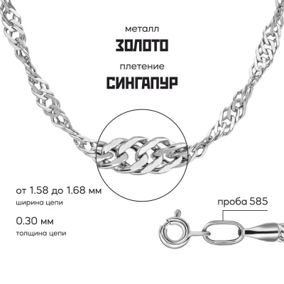 Московский Цепевязальный Завод - современный взгляд на вековое наследие цепевязания: неизменно высокое качество, технологичность и надежное российское производство. "Сингапур" – цепь создана на основе двойного панцирного плетения. Звенья соединены между собой таким образом, что цепь начинает красиво переливаться. Сложная спиралевидная структура обеспечивает блеск при вращении в лучах света. Плетение отличается утонченностью, нежностью и легкостью. Украшения превосходно дополнят и вечерний наряд, и повседневный образ. Бренд изделия может отличаться от заявленного в описании. В этом случае украшение под другим брендом по своим качественным и потребительским характеристикам ничем не уступает указанному в описании. Фактический завод-производитель указан на бирке каждого изделия.